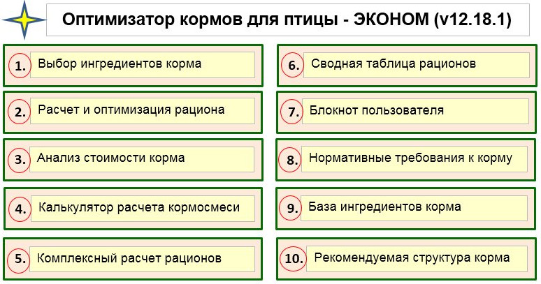 Ключевые слова: кормление птицы, программа по рационам, расчет рационов, рационы для птицы, сбалансированный корм, оптимизация корма, калькулятор корма, оптимизация кормовых рационов.